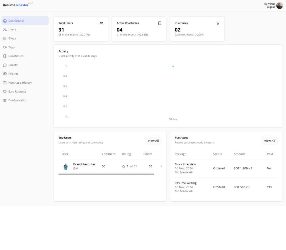 Resume Roaster is a web application designed to provide tailored resume feedback and professional writing services. Built with Next.js, PostgreSQL, Prisma, and Tailwind CSS, it integrates GPT-4 for AI-powered recommendations. The platform also includes peer-to-peer reviews with a points-based system, fostering a collaborative and engaging experience. Targeting freshers, experienced professionals, and programmers, it helps optimize resumes for job-specific success.